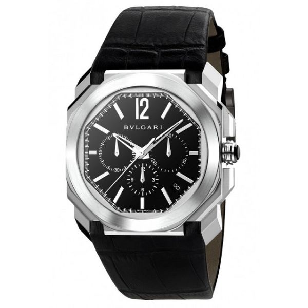 Silver-tone stainless steel case with a black alligator leather strap. Fixed silver-tone stainless steel bezel. Black lacquered polished dial with silver-tone skeleton hands and index hour markers.Dial Type: Analog. Date display between 4 and 5 o'clock position. Chronograph - three sub-dials displaying: 60 second, 30 minute and 12-hour. Bvlgari Calibre BVL 328 Velocissimo Automatic movement, based upon Zenith El Primero 400, containing 31 Jewels, bitting at 36000 vph, and has a power reserve of approximately 50 hours. Scratch resistant sapphire crystal. Screw down crown. Transparent case back. Octagon case shape, case size: 41 mm, case thickness: 8 mm. Band width: 22 mm, band length: 8 inches. Fold over clasp. Water resistant at 100 meters / 330 feet. Functions: chronograph, date, hour, minute, second. Luxury watch style. Watch label: Swiss Made.