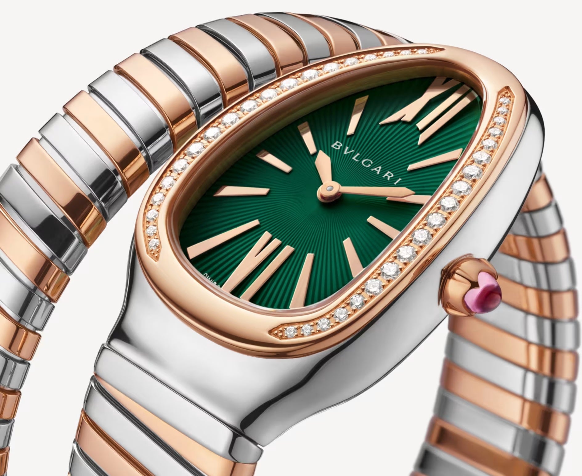 Merging two of Bvlgari's most iconic aesthetic signatures, the Serpenti Tubogas single-spiral watch in 18 kt rose gold and stainless steel blends the sinuosity of the snake with the modern essence of Tubogas. The head of the mythical creature is brought to life through a diamond-set bezel and a green lacquered soleil dial, while the mesmerising suppleness of the bracelet evokes the fluid lines of the serpent's flexuous and coiling body. An enchanting fusion of magnetic charm and legendary jewellery mastery.